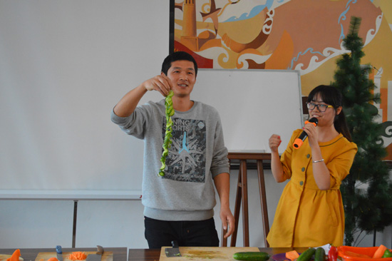 下午三点,活动正式开始,整个文化展厅坐满了期待已久的学生,准备享受一场中国饮食文化“盛宴”。活动首先由孔子学院老师以PPT及实物展示形式向学生介绍中国各大菜系及饮食文化特点。接着孔子学院老师以胡萝卜和黄瓜现场向学生展示了精湛的刀功,引得现场阵阵惊叹,学生也不甘示弱上台一试刀功。