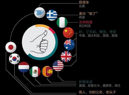 这是中国最常见的手势,表示夸奖和赞许,意味着“好”、“妙”、“了不起”;在日本,这一手势表示“男人”、“您的父亲”;在南朝鲜,表示“首级”、“父亲”、“部长”和“队长”;在美国、墨西哥、荷兰、斯里兰卡等国家,这一手势表示祈祷幸运;在北美、印度、法国等国家,则是在拦路搭车时横向伸出大拇指表示要搭车;在希腊,伸出大拇指表示够了;在印度尼西亚,伸出大拇指指东西;但在尼日利亚,竖大拇指则是一个粗野的动作。