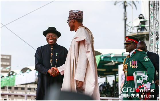 (尼日利亚总统就职仪式上两任总统握手致意)
