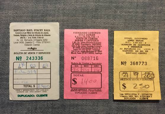 图片说明:收据,名片大小,票面写有法人代表姓名及身份证号、商店经营范围、商店地址(连锁店要写出所有店铺地址)、收据票号、交易日期及金额,等等。最右边一张是蔬菜店的收据,金额250比索,相当于人民币2块多。