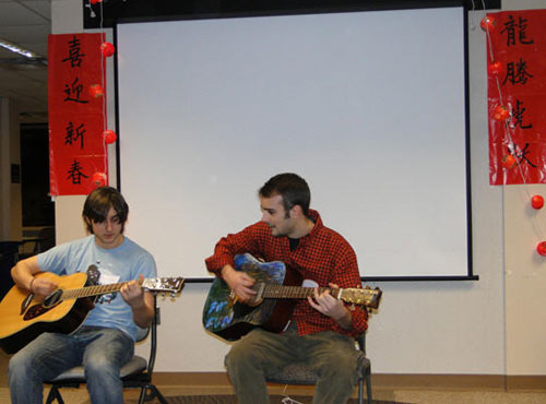 联欢会上,孔院教师和志愿者通过PPT介绍了春节所蕴含的丰富的中国文化信息,并通过问答的方式让大家对春节有了进一步的认识;接龙猜词游戏不仅展现了每一个参与者的表演才能,而且也检验了参与者的汉语水平;抢椅子、踩气球、宾果等游戏高潮迭起,台上台下欢声笑语;孔院教师和志愿者的合唱《明天会更好》、学生吉他演奏《I like Chinese》、小提琴演奏《二泉映月》、歌曲《但愿人长久》等赢得了阵阵掌声,气氛热烈!