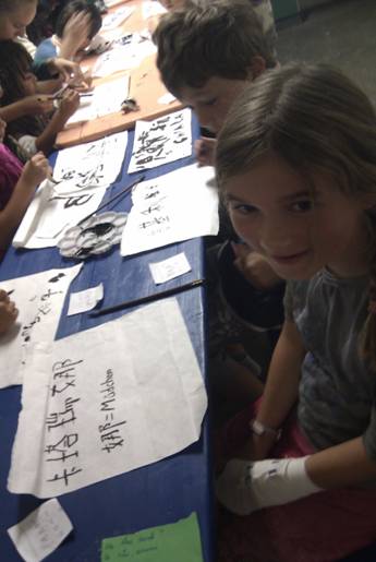 吃过午饭后,同学们各各精神饱满,继续体验中国文化。接下来练习写毛笔字。为了让孩子们体验毛笔字的规范性,老师先教了怎样握笔和怎样沾墨,然后讲了“横”和“竖”的写法,让学生从数字“一、二、三”写起。这样,孩子们对毛笔也有了初步的认识。接着每个同学都写了自己名字,他们得意洋洋的向其他同学展示自己的“作品”,然后都满意而小心把它地放进了书包。