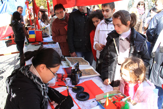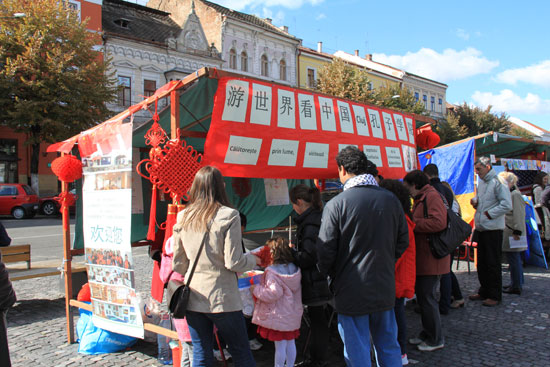 10月15日至16日,在克鲁日市中心的统一广场,赫然入目的"游世界、看中国"横幅、红红火火的中国结、悠扬婉转的中国民歌、浓浓的茉莉茶香吸引了众多克鲁日市民在孔院展位前流连忘返。现场的中国茶道表演、饮食及绘画书展、琳琅满目的罗语版茶文化宣传册及孔子名言书签、中国剪纸艺术和"九连环"、"毽子"等传统益智游戏让人们对中国文化有了更为深刻的认识。此次活动,中国教师现场为300多人书写了中文名字,中国汉字的文化魅力再一次获得了人们的喝彩。500多人品尝了中国茶,西湖龙井绿茶、铁观音、普洱茶及茉莉花茶的独特香气让克鲁日市民回味无穷。
