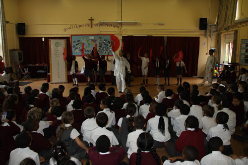 在圣约瑟夫小学的演出当天,演员们一进场,学习过一年中文的学生们就热情整齐地向演员们问候: “你好”!你好”!。演出过程中的太极扇、舞蹈互动环节让英国孩子们亲身参与、近距离地感受中国文化魅力。演出过程中掌声与欢笑声此起彼伏。表演者以他们精彩的技艺获得了大家的认可和赞扬。演出结束后,孩子们大声地对演员们说: “谢谢!谢谢!”
