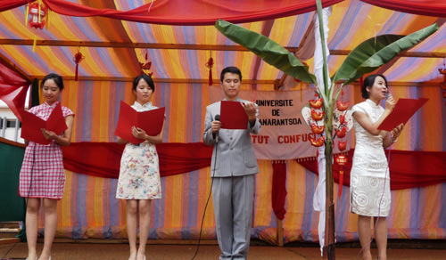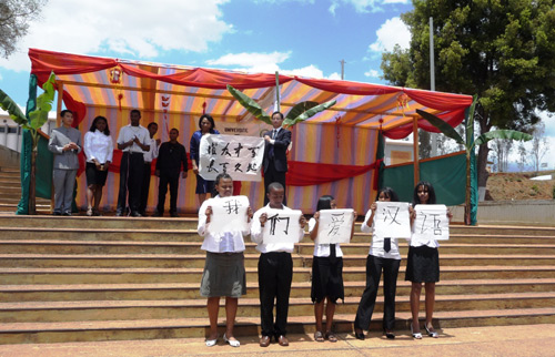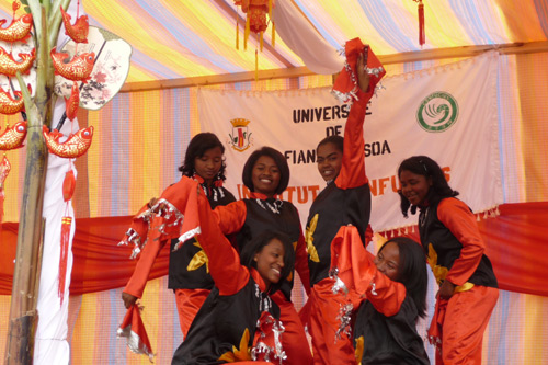 在菲亚纳兰楚阿大学,喜庆的宫灯、吉祥的中国结和靓丽的中国红让大学校园呈现出浓郁的中华文化氛围。伴着嘹亮的中华人民共和国国歌,五星红旗首次升起在菲大校园。菲大中华文化体验活动融歌唱、舞蹈、朗诵、书法与太极拳表演、中国国情知识抢答于一体,并组织游戏让观众参与。该校汉语专业学生带来的大合唱——《北京欢迎你》赢得雷鸣般的掌声;当中马师生一起表演太极拳时,许多观众也忍不住跟着模仿起来。游戏“不到长城非好汉”将整个活动推向了高潮,中马双方通力合作,共同完成了游戏任务。活动中,师生们还演示了书法,中方教师黄增寿博士当场挥毫书墨,写下“中马友谊地久天长”,赠给菲亚纳兰楚阿大学校长莫妮卡。