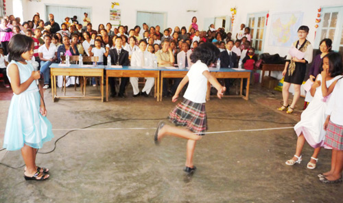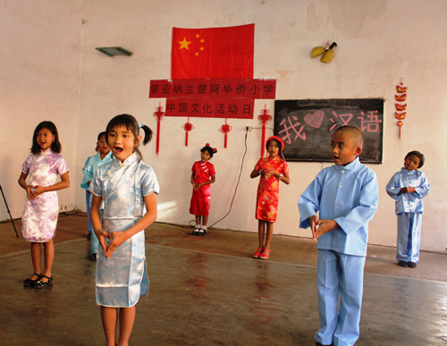 在菲亚纳华侨小学,小朋友们穿上节日盛装和家长们一起参加中华文化体验活动。活动中,小朋友们表演了日常汉语会话,体验了中国传统游戏跳皮筋,演唱了中文儿歌,朗诵了中文诗歌,并展示了中国书画作品。孩子们出色的表现博得了全体家长的欢心。华侨小学董事长在活动中表示,汉语已经成为了华侨小学的一张名片,华侨小学已成为当地传承和光大中华文化,促进中马文化交流的重要阵地。