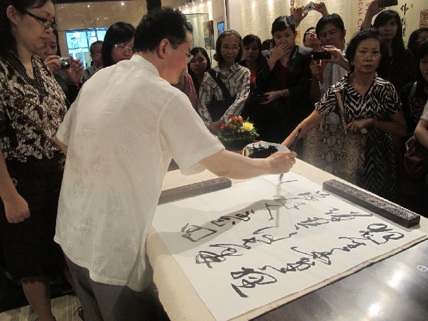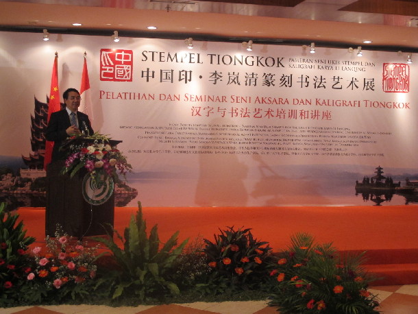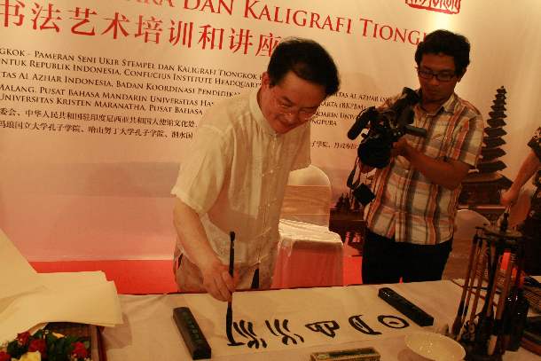 10月19日下午,中国印•李岚清篆刻书法艺术作品展之汉字与书法艺术培训与讲座在印尼国家博物馆成功拉开帷幕。该活动是继10月12日到10月14日成功举办的篆刻艺术培训与讲座之后,中国印•李岚清篆刻书法艺术作品展的另一个系列活动。此次活动吸引了印尼各界人士,参加当天开幕式的人数就达500余人。其中部分学员已经参加过刚刚结束的篆刻艺术培训与讲座,更有一部分学员是慕名而来的书法爱好者。