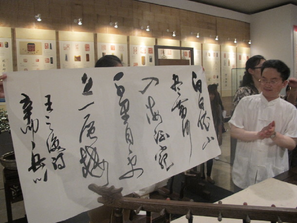 开幕式结束后,北京大学书法研究所所长王岳川教授为在场的嘉宾听众主讲“中国书法艺术”。王岳川教授向听众介绍了汉字的各种字体,并亲自示范书写。他挥洒肆意,写出来的字苍穹有力,大家纷纷围绕在王教授的作品周围,欣赏中国书法的独特魅力,全场一片惊叹!