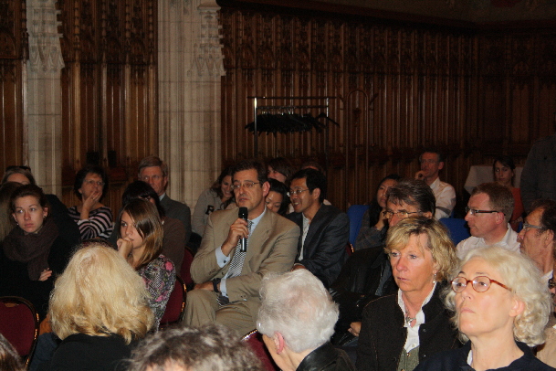 校长默哲思先生首先致辞。他高度评价了阿尔多瓦孔子学院自成立以来所发挥的积极作用,高度赞扬了我们的合作好伙伴百年名校南京大学的睿智与博大,感谢为促成此次讲座而奉献力量的各方,同时向佩文森先生致敬,并对其到来表示热烈的欢迎。佩文森先生先后在上海和北京度过了10多年的光景,作为法国驻华大使馆的商务参赞,他对阿尔多瓦孔子学院在法国北方所作出的各方面的努力与成效给以了肯定。讲座围绕着“中国经济实力现状”、“中国经济未来走势”、“中国经济增长方式的改变”、“中国经济对世界经济的影响”,以及“法资企业在中国的现状”这五个主题展开。期间,佩文森先生还播放了他精心准备的关于中国其他省会城市的影像资料,为到场的各位呈现了一个开放、现代而又有责任心的中国。讲座接近尾声之时,现场的观众依然意犹未尽,纷纷向佩文森先生提问,迫切地想要了解更多关于中国的信息。最后,校长默哲思先生接过话筒,感谢佩文森先生的精彩讲座与现场观众的到来,并邀请大家参加随后的酒会,继续与佩文森先生一起谈中国。