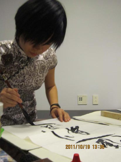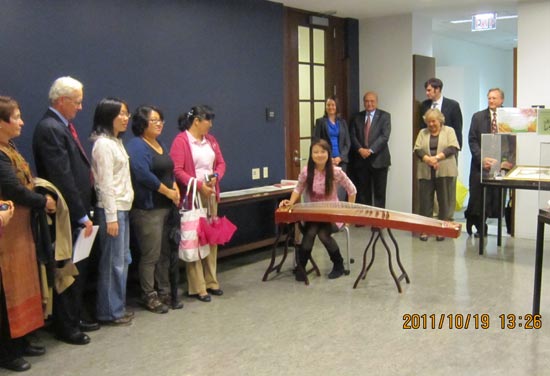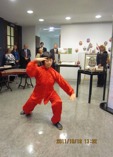 这一仪式的特色,在于虚拟展示、实物展出和真人表演的巧妙结合。出席者不仅得以在互动式电脑展示台上领略中国文化的各个方面的魅力,而且目睹了一系列带有中国文化特色的实物—中国剪纸、中国刺绣物、中国的文房四宝等,并且欣赏了汉办派遣的肯塔基大学孔子学院汉语教师的精彩才艺展示――张丹丹的古筝弹奏表演、周玉芳的太极表演和季云姝的书法表演。