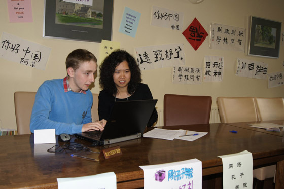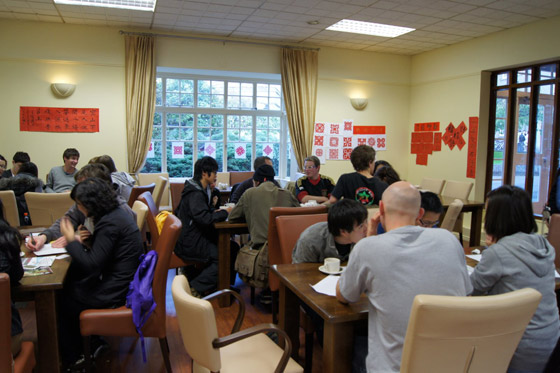 当天下午,孔子学院的教师和志愿者们早早来到会场,用书画、灯笼和中国结将室内装饰得暖意融融。在浓浓的东方氛围中,来自各个国家的教师、大学生和中国的留学生们亲切地交谈着,畅聊彼此的爱好及对各自国家文化的喜爱。学生们根据自己的语言水平、性格爱好,以及课余时间选择学习外语和异国文化的伙伴。
