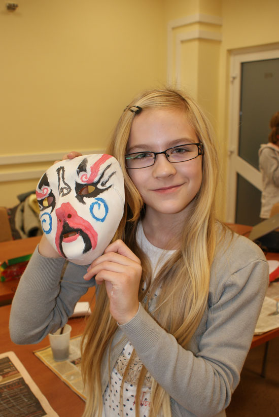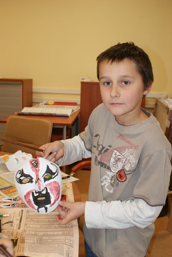 京剧脸谱艺术是非常具有中国民族传统特色的一种化妆方式,通过脸谱来直接表现历史人物的不同身份、性格、特征等,而且美与丑有着完美的统一。参加文化活动的小学生们在孔子学院教师何悠女士和谷乐燕(Kamila Wiatr)女士的帮助下,很快就在京剧脸谱的模型上色画出了栩栩如生的包括生、旦、净、丑等不同类型的脸谱。戴上自己制作的中国京剧脸谱,更是这些可爱的孩子们的令人激动的时刻,大家互相欣赏,还纷纷请谷乐燕老师为他们拍照留念。戴上中国京剧脸谱,就好像真的来到中国京剧艺术的舞台,体会到中国京剧艺术的无穷魅力。小朋友们和家长们纷纷打听孔子学院下一次专门为小学生所安排的中国文化活动,表示期盼着参加更多这样的周末文化活动。
