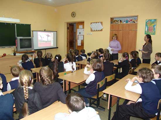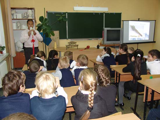 今年春天,孔子学院在伏尔加格勒第三中小学(Гимназия №3)的首次汉语体验课取得圆满成功,本学期该校选修汉语课的小学生达30人。10月24日,孔子学院再次应邀到第三中小学为四年级的师生举办中国文化讲座。中外方院长介绍了中国人文地理概况和节日风俗,生动地讲解了中国民族音乐,并展示了中国古代乐器编钟的模型,以及揭牌仪式上我校赠送的中国传统民族乐器葫芦丝和埙。中国留学生用葫芦丝演奏的《彩云之南》深深吸引了在场师生,赢得了热烈的掌声。讲座过程中,学生们表现出了对中国文化浓厚的兴趣,并不时有人举手提问。在讲座之后的提问时间,学生们更加踊跃,中外方院长耐心解答了学生们的问题。