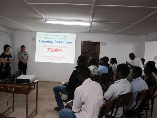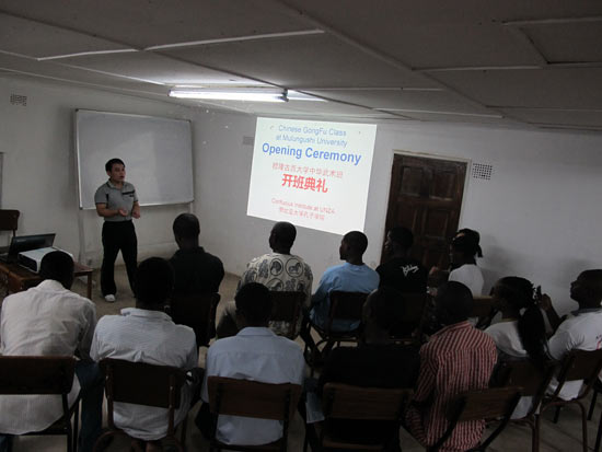 11月4日,赞比亚大学孔子学院在穆隆古西大学举办第一期中华武术班开班仪式,穆隆古西大学学生处处长、孔子学院中方院长何懿、武术教师王锦忠、汉语教师牛习全及20多位学生参加了开班仪式。