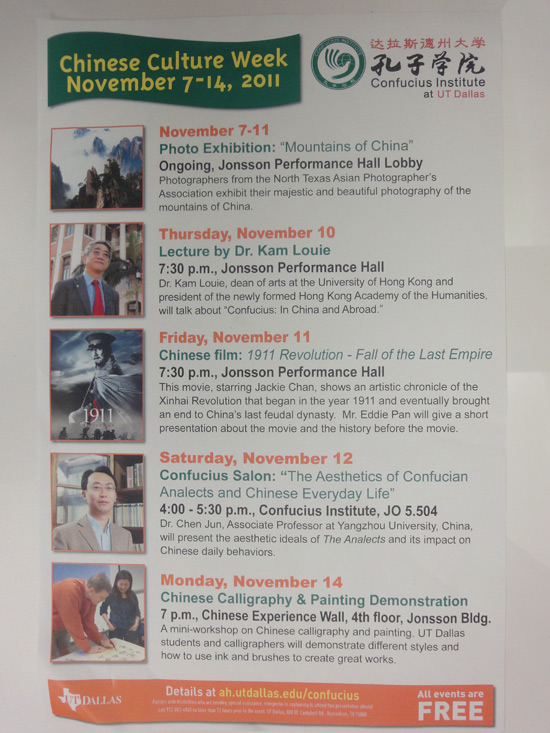 2011年11月7日至14日,达拉斯德州大学孔子学院中国文化周精彩开幕。这次文化周活动丰富,内容创新,吸引了众多的中国文化爱好者。