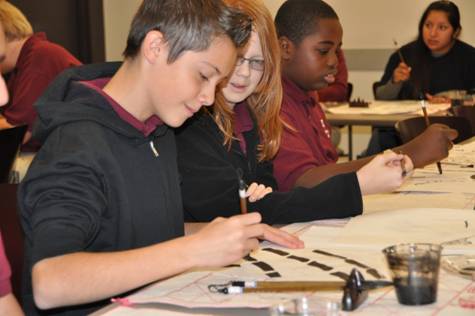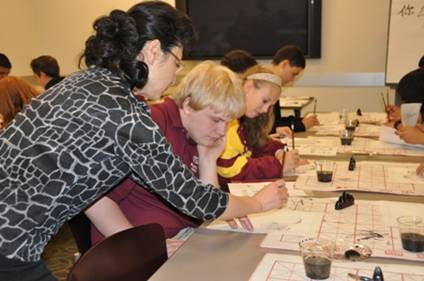 来自ASU 附属中学的学生手握毛笔,细致的临摹中国画