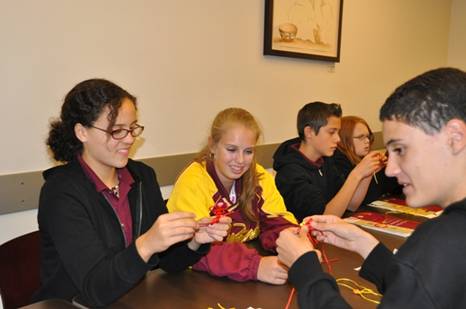 亚利桑那州立大学孔子学院特意邀请Sophia Lee老师教同学们做中国结。老师先简单介绍了中国结的意义。” 结”在中文 中的意思是“REUNION”,代表大家相聚,所以中国结代表了吉祥如意,亲朋团聚。Sophia 老师还给同学们展示了丰富的中国结的图案,有传统红色系列的吉祥结,还有用不同颜色的绳编织而成的各种创意图案,如菠萝、草莓、鱼、花儿等等 。 同学们对如何用一根绳子编成这么多丰富图案充满好奇,都蠢蠢欲动,想拿起绳子来尝试。这次文化课的 Sophia老师将教大家用中国结的编织手法制作蜻蜓。在此之前,Sophia 老师播放了一段视频短片,是让她的一个学生现场演示蜻蜓的做法,并加以详细的解说,同学们看得非常专心。 终于到了动手的时候了,同学们迫不及待的拿起绳子。 然而视频里看起来简单的动作,可是真动起手来就发现不容易了,纷纷向老师“求救” 。不过在老师的指点下,同学们迅速把握编织的要领,手下的蜻蜓逐渐成型,他们对自己的精心编织的可爱蜻蜓非常满意。