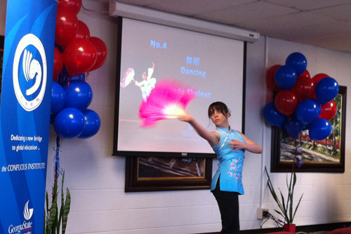 据悉,此次“中华才艺比赛”是GSU孔子学院2011文化系列活动之一。自2011年年初至今,GSU孔子学院已先后举办了“2011美国兔年邮票首发仪式暨中国生肖文化艺术节” 、“亚城之春”大型春节文艺晚会、“第二届亚特兰大中国电影节”、中国书法篆刻及绘画艺术班等一系列文化活动。GSU孔子学院所举办的系列文化活动获得了当地民众的热烈欢迎和一致好评。近期,佐治亚州立大学孔子学院还将应全球最大的家居建材零售商、美国第二大零售商、世界500强企业家得宝公司(Home Depot)的邀请,为其量身设计并举办中国文化主题活动。佐治亚州立大学孔子学院也将不断地为亚特兰大民众提供更多了解中国艺术文化的机会,为传播和推广中国文化,进一步促进中美之间在艺术文化方面的交流作出自己的最大贡献。