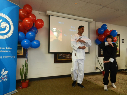 本次比赛的18个节目中,有25人进行了精彩纷呈的表演。表演功夫和太极拳的高中生Samuel Eppstein和Shane Conton,第一个出场便一鸣惊人。台上一分钟,台下十年功,他们俩直到表演前一分钟还在走廊上认真练习。GSU中文学分课学生Jade Shelnut曾经学过芭蕾舞,但现在却迷上了中国舞蹈。她身着霓裳、手持羽扇,表演了中国扇子舞,博得观众阵阵喝彩。