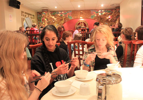 “中华之旅”少不了正宗的中餐。学生们步入一家点心店,除了享受中华美食,他们还有一个重要任务:用课堂上所学的汉语知识,在真实的环境中与餐馆的服务员交流——询问菜名、请他们添水加茶、关心他们在英国的生活情况、找洗手间……不一而足。学生们既品尝了佳肴(扬州炒饭尤其受欢迎),又锻炼了汉语口语,正可谓精神物质双丰收。