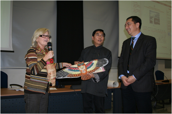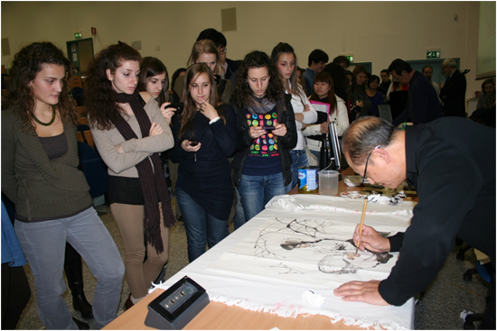 11月的意大利天气阴冷,而庆祝现场却气氛热烈、热闹非凡。下午4时许,米兰国立大学孔子学院意方院长兰珊德(Lavagnino)教授,中方院长金志刚教授分别发表了热情洋溢的讲话。总结了两年来的成绩,也表达了对孔院未来发展的热切希望。之后,5位专程从中国远道而来的艺术家开始了他们精彩绝伦的艺术表演。表演包括中国书法、绘画、风筝、面塑和剪纸。艺术家们八仙过海各显神通,令在场观众如痴如醉、流连忘返。中国著名书画家王子和先生现场赋诗一首,并现场创作成一幅精妙的书法作品,表达了对米大孔院的美好祝愿;中国著名画家毕克勤先生现场挥毫,寥寥数笔,一个高原女孩形象跃然纸上,引来观众的热烈掌声;著名风筝制作家吕铁智先生的桌前挤满了为风筝涂色的观众,有些学生干脆趴在地上画起来;彭小平先生的面塑作品表演也令观众爱不释手、惊叹迭起;付秀清女士表演剪纸时,她不仅手把手教观众们下剪,更向他们娓娓道来剪纸作品中的文化故事,大家都听得兴趣盎然。现场气氛热烈非常,观众们无不感叹中国文化的巨大魅力。