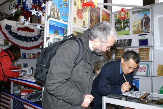 整个活动中,汉语教师孙强老师和季青老师分别向保加利亚民众现场展示中国书法和剪纸艺术,吸引了众多对中国文化感兴趣的人驻足观看。前来求字的人络绎不绝,展位前总是人头攒动。有的人要写下他们中文的名字,有的人想求个家庭和睦的字,有的人想要个新年的祝福,还有的武术迷要写下武术泰斗的名字……他们一边等着求字,一边观看剪纸,惊叹于普通的红纸在一把剪刀的剪裁下,很快变成了一个个形态各异的雪花和双喜,感到分外神奇。对于拿到手的剪纸和书法作品还不忘问问其中的文化内涵,最后拿着赠品高兴地离开。