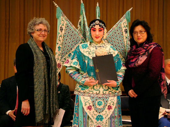 为表彰纽约梨园社弘扬京剧国粹、积极推动文化交流的善举与盛意,佩斯大学孔子学院也向梨园社从中国邀请来的国家著名京剧表演艺术家张建国、邓沐玮、高红梅、何威、李扬等颁发了“中国文化奖”。佩斯大学戴森文理学院院长Herrmann和孔院牛卫华院长共同颁奖。