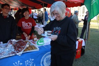 2011年11月17日下午3点,在特洛伊大学Bibb Grave 大楼前一派热烈的场面,悠扬的二胡曲子荡漾在校园上空,红火的灯笼和中国节、香气扑鼻的饺子和春卷,让校园里再一次充满中国气息。这是特洛伊大学孔子学院参与特洛伊大学国际教育周的又一序曲。