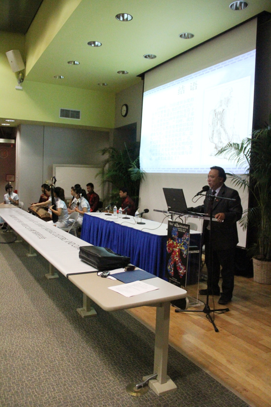 此外,巡演团副团长、音乐学院院长马东风教授还应邀在11月18日举办的迈阿密“现代书展与中国语言文化传播”国际研讨会上做了题为《孔子与音乐》的专题讲座。马教授不疾不徐地在古朴典雅、流畅婉转的《春江花月夜》名曲里开讲。他的讲座涉及孔子的生平、音乐实践、音乐贡献、音乐教育思想等内容,孔子学院中方院长张蓊荟博士担任现场同声传译。与会的中外学者和美国观众对这种融学术及音乐欣赏为一体的讲座形式叹为观止,他们纷纷表示不但对孔子的音乐教育思想有了较为深刻的理解,而且还享受到了一场中国古典音乐的盛宴。