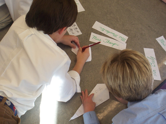 学生趴在地上,认真地装饰纸鹤——书写汉字“感谢”