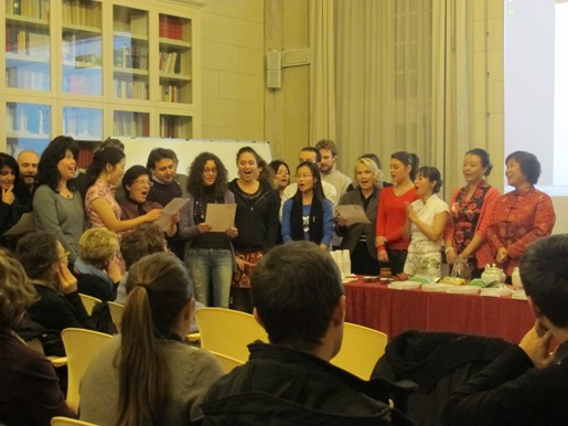 随后,本次专题讲座的主讲人、比萨孔子学院陈镛老师开始向大家详细阐述中国茶文化的起源、发展和应用,以及不同种类的中国茶不同的制作工艺、药用价值等。当介绍到中国茶的特色泡制方法——功夫茶时,她向大家展示了独具中国传统特色的紫砂壶茶具,并由比萨孔子学院的老师当场演示了如何泡制和品茶。其含蓄悠远的中国文化韵味深深吸引了在场的所有外国朋友。讲座结束时,比萨孔子学院汉语中级水平二级班的全体同学还集体为大家献上了一首优美动听的中国传统民歌《茉莉花》。悠扬的歌声将活动推向高潮。