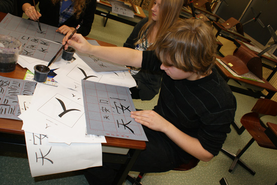 在高年级的认识汉字及汉语书法班上,古乐燕老师耐心地向同学们讲解汉字结构,并讲解了汉语书法的特点和要领,然后同学们第一次握起中国毛笔,开始练习使用毛笔字,并最终学会用毛笔写出“大”、“小”、“天安门”等字。看着搞得满是墨的手,他们感慨道,汉语书法真是艺术,学会汉语书法可真是不简单啊。