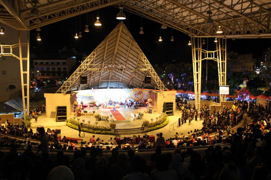夜幕降临,勿洞市音乐广场座无虚席,掎裳连袂,人山人海,热闹非凡。勿洞孔院的演员们与YALA RAJABHAT UNIVERSITY(也拉皇家大学)中文系本土汉语教师PHAKO NOPARIT(陆广民)共同为现场观众呈献了一套中国民族音乐歌舞表演节目——《婚誓》,拉开了晚会文艺表演的序幕。优美动听的葫芦丝演奏,婉转悠扬的情歌对唱,翩跹摇曳的婆娑舞姿,素雅别致的民族风长裙,带给了观众极美的享受,台下不断响起雷鸣般的掌声。接下来,由勿洞市各学校、政府单位等团体选送的优秀节目也一一展现在观众的眼前。而在当晚的活动中,来自马来西亚的歌手孙艺绫和泰国明星Mos patipa的精彩演出更是将整场晚会推向了高潮,观众们踏着音乐节奏,挥舞双臂,高声喝彩!伴随着新年脚步的临近,全场观众和主持人一起倒计时:……3——2——1——,刹那间,腾空而起的烟花,在夜空中璀璨绚烂地绽放,大家在欢声笑语中辞别旧岁迎来新年。