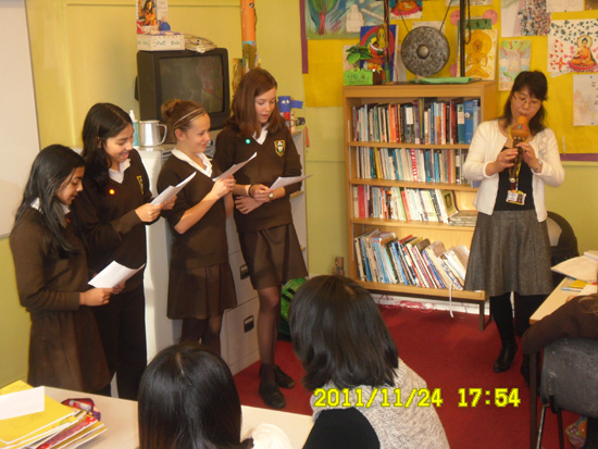 葫芦丝是云南傣族的特有乐器,在英国学生中鲜有人知,用这种独特的乐器伴奏经典歌曲,别有一番风味。同时在教学生认读中英文的歌词的同时,帮助他们又学会了许多汉字。这种“寓教于乐”的形式,很受学生的欢迎。在教汉语语言的同事,学生又感悟了中国艺术文化的魅力,真可谓是一箭双雕!