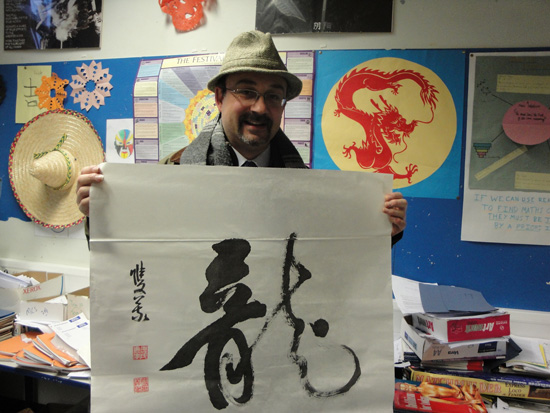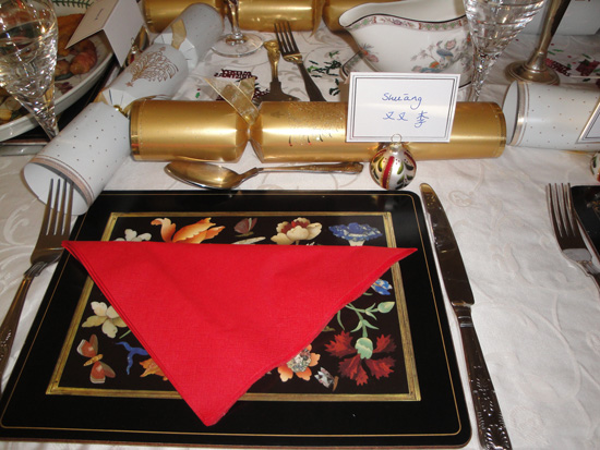 “有朋自远方来,不亦乐乎”。2011年圣诞佳节,英国国王中学孔子课堂汉语教师李双义应邀去孔子课堂负责人Mr. David Haslam家里做客,在感受浓浓圣诞氛围的同时,也在传递着中国文化。书法作品《高山流水》《龙》,剪纸《中国龙》等等,作为特别的礼物,大受欢迎。