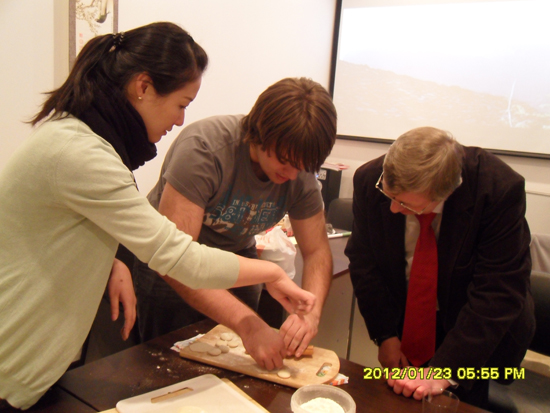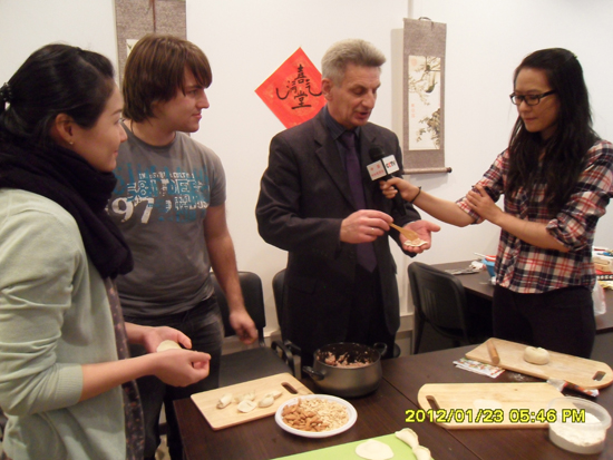 大幅的福字、火红的春联、《步步高》的中国传统民乐,营造出浓郁的中国年氛围!热气腾腾的饺子更是引起了俄方友人的浓厚兴趣,学包饺子可不是件容易的事情,但是很多莫斯科国立语言大学的教师和同学们却学得非常认真,虚心求教,进步神速。看着自己亲手包好的饺子,都笑逐颜开。