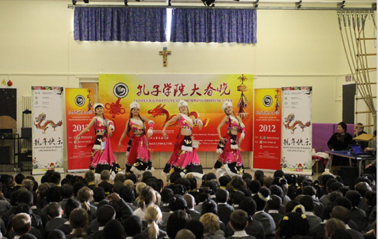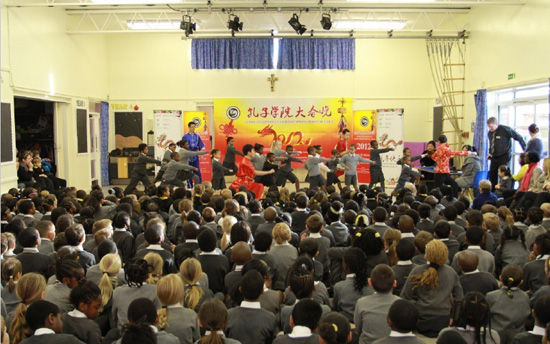 整场演出可谓高潮迭起,精彩纷呈,演出现场师生们情不自禁的鼓掌伴奏,表达了对中国文化发自内心的向往和今后汉语学习的热情。校长及副校长也观看了我们的节目,并给予了高度赞扬。表演结束后,在老师的带领下,全体学生一起用中文向演员们说“谢谢”,“新年好”“再见”,场面十分感人。看来中国的语言、文化已经开始根植于英国孩子们的心中——中国已不再陌生。