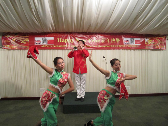 招待会期间,伦敦中医孔子学院2012年新年巡演节目之唢呐独奏---“好日子”,应邀到议会演出并受到观众的一致好评,成为当日一道亮丽的风景线 。演出结束后,很多议员及爵士纷纷与来自伦敦中医孔院的三名演员合影留念并对他们精湛的演技表示赞扬。来自上议院的考特爵士说道:”唢呐演奏与中国舞蹈为新年庆典添加了浓浓的节日气氛。演员们的精彩演出是传递中国文化的最佳方式之一。我非常高兴看到今天的演出!”