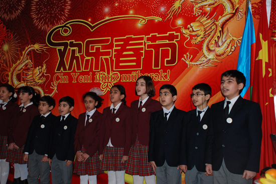 巴库大学孔子学院学员与巴库大学附中学生用中文表演了中国歌曲《新年好》、《朋友》、《月亮代表我的心》、《友谊地久天长》,绕口令《四和十》,诗朗诵《再别康桥》,太极拳等精彩节目。阿方小朋友用中文向宏大使拜年,并调皮地说:“恭喜发财,红包拿来”。宏大使向他们发了贺岁红包。现场气氛欢乐融洽,消除了国家、民族、语言界限,大家真正感受到中阿人民之间的心灵沟通与和谐,沉浸在中国春节文化的魅力和欢乐氛围中。