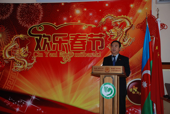 宏大使在讲话中说,“欢乐春节”活动是中国文化部、外交部、教育部、国家广电总局、国务院侨办等多部门在海外统一推出的一项重要对外品牌活动,突出“欢乐”、“和谐”、“共享”理念,凸显“欢乐春节,和谐世界”主题。通过形式多样、内容丰富的文化活动,向世界展示中华文化的悠久历史和独特魅力。巴库大学孔子学院作为培育中文人才的摇篮、促进中阿友谊与人文交流的平台,举办“欢乐春节”活动具有重要意义。相信通过举办此次活动,将更好地帮助友好的阿塞拜疆人民了解中国文化和亲情、友情、和谐、和平的人文情怀与价值理念。中国驻阿使馆将与阿方一道努力,把孔子学院办得越来越好。