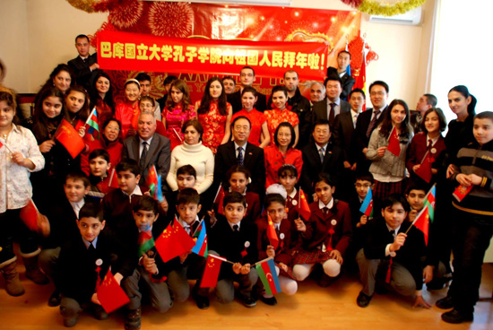 1月27日,在中国驻阿塞拜疆使馆倡议、支持和帮助下,阿塞拜疆巴库国立大学孔子学院承办阿首次“欢乐春节”活动。宏九印大使出席并在活动前会见巴库大学校长马哈拉莫夫。“欢乐春节”活动现场-巴库大学孔子学院内布置得喜气洋洋、春意盎然,中国传统春联、大红灯笼、中国结、五彩香囊、书法字画等中国传统文化符号共同描绘出一派欢乐的新春气象。宏九印大使、矫怀欣参赞、巴库大学副校长马梅多娃、孔子学院中方院长胡凤华、阿方院长扎里贝里,阿总统战略研究中心代表拉沙德、阿武术学会代表以及孔子学院学员、巴库大学附中学生、阿高校中文爱好者、在阿中国留学生、华为公司等中资企业代表共80多人出席了“欢乐春节”活动。