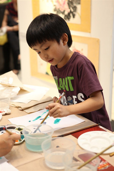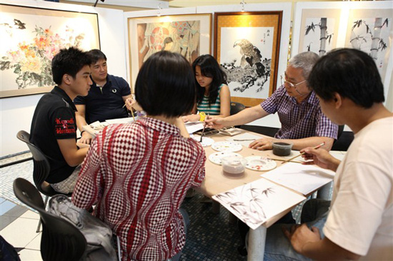 1月22日下午,两场太极拳和古筝表演吸引了商场里前来购物的市民,表演结束后,国画工作坊开始,由国际中国艺术研究会的画家们及孔子学院国画班师生任教师,为前来观展的民众现场教画。来学画的人数众多,近百人参与了学画,看到自己亲手绘制的中国画作品都非常开心。
