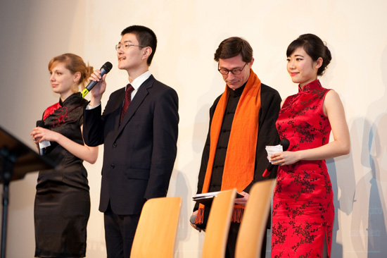 四位双语主持人(右起一海德堡孔院汉语教师志愿者王洋,二汉学博士林山石先生,三海德堡大学学生马旻杰, 四海德堡大学汉学系学生Sohpia)