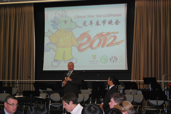 美国中部时间2012年1月24日晚,瓦尔普莱索大学宴会厅(Union Ballroom)内灯火通明,红灯高挂,各式中华传统糕点和美食琳琅满堂,瓦大师生、瓦大孔子学院/孔子课堂学员、中国留学生、当地居民和社会各界人士共400多位来宾齐聚一堂,共同庆祝中国传统佳节——春节的到来。2012年春节晚会由瓦大孔子学院、瓦大中日研究项目、中国学生学者联合会共同主办,迄今已是第十三届。晚会还得到瓦大姊妹学校——浙江工业大学的大力支持。应瓦大孔子学院邀请,该校选派两位音乐教师和一位武术教练专程赴美参与演出,并随后在孔子课堂、当地中小学进行为期一周的巡回演出和现场教学,共计10场。