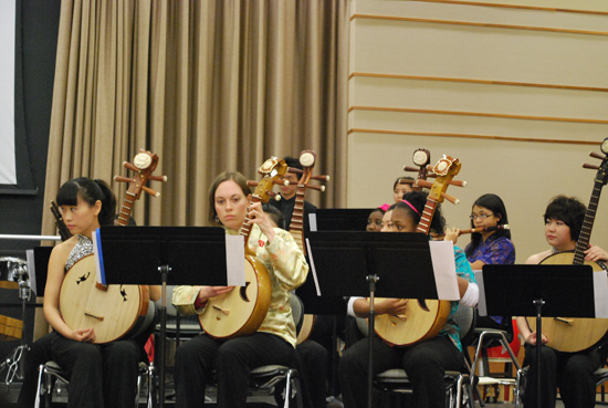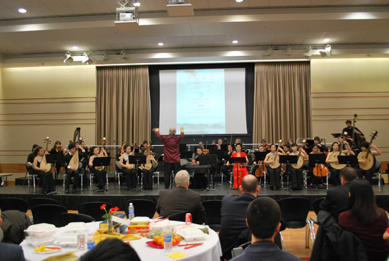 接着,来自浙江工业大学的三位教师为来宾们表演歌曲和武术套路,拉开晚会序幕。随后,由中央音乐学院巡演团和瓦大室内音乐乐团合奏《祭孔音乐》,之后由中央音乐学院巡演团为观众献上了一场异彩纷呈、美仑美奂的表演。所演奏的曲目中,既有广为流传、余音绕梁的古琴曲目《流水》,又有中西合璧、婉转动人的二胡与大提琴合奏《菊花台》;既有旋律欢快流畅的新疆民歌《送我一枝玫瑰花》,又有情真意切的情歌经典《走西口》。中场休息后,由孔子学院美方院长孟剑云教授领衔瓦大孔子学院中国民乐团、瓦大室内音乐乐团、西娅•博曼领导学校孔子课堂中国民乐队,同中央音乐学院乐队一道演奏了耳熟能详的《金蛇狂舞》、《茉莉花》等曲目。身着中国传统服装的美国师生和中国艺术家同台演奏中国传统曲目,更添喜庆欢乐的节日气氛。值得一提的是,中央音乐学院主持人和瓦大中文教师白睿伟(Benjamin Ridgway)博士分别用各自的母语向观众介绍了每首曲目的背景故事,使观众在欣赏美妙乐曲的同时,更深刻地理解乐曲背后的内涵,加深了他们对中国文化的了解。