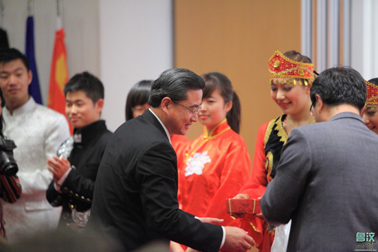 王鲁新参赞向艺术团同学赠送礼物表示感谢