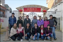 2012年1月22日,中国农历春节除夕,加德满都大学孔子学院中文教师与志愿者教师在老师们居住的小区Sunrise Homes小区大门上悬挂起大红灯笼和红底黄字的大幅中英文“欢度春节HAPPY FESTIVAL"横幅,张灯结彩过大年。
