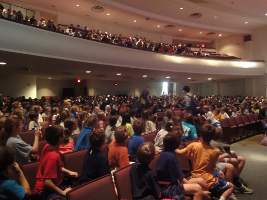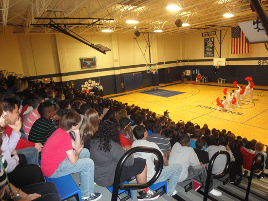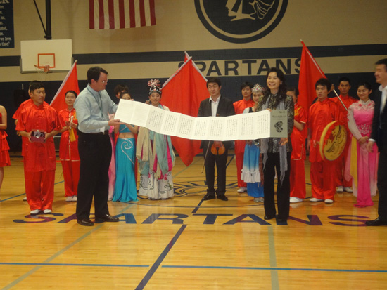 中午,三巡团又赶往高地公园学区的麦卡洛克中学礼堂,UTD孔子学院在该学区已经建立了孔子课堂,2011年的三巡团曾在这个学区让近4000学生获益。在学区的强烈要求下,这次又安排了这场演出。学校领导十分重视,由助理校长亲自组织了10多位老师布置舞台,调整音响和灯光。下午2:00演出按时开始,约600师生观看了表演。艺术团演员不顾疲劳,情绪饱满的精彩表演赢得前总统小布什社区师生的阵阵掌声,该校校长和对外经贸大学校长交换了礼品。