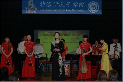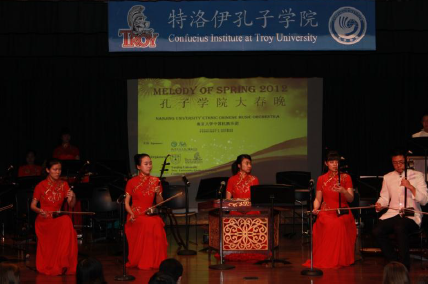 由国家汉办孔子学院、南京大学、美国特洛伊大学孔子学院联合举办的“2012孔子学院大春晚”在2月2日拉开了帷幕,由南京大学海外教育学院程爱民院长、吕浩雪院长、张静波教授带队,在美国特洛伊大学---多森校园 (Troy University--Dothan) 举行了中国民族音乐的演出,以精湛的表演为多森市民奉献了一场中国民族文化大餐。这是有史以来,中国民乐团第一次到阿拉巴马州来表演,演出非常成功。