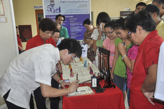 春节期间,红溪礼示孔子学院还到菲律宾国家图书馆举行了庆祝龙年新春中华文化体验活动。本次文化体验为期四天,分为中国书法、传统茶艺、及文化体验互动(包括文化实物展及总部所赠送之文化体验设备)等。参加体验活动的人员主要为菲律宾主流大中小学生和教师,他们对制作精美、文化气息浓厚的展览表现出了极为极高的热情。展出首日就有来自马尼拉地区8所大中小学生乘坐着大巴从各地赶来参观,首日预计学生人数突破5000多人次。菲律宾国家图书馆馆长桑托斯也亲临现场剪彩。孔院汉语教师志愿者每天在现场表演书法和茶艺,进一步展示了中华传统文化独特的艺术魅力和博大精深的底蕴,赢得了参观者的阵阵喝彩,前来索要书法作品和品茶的民众不计其数。